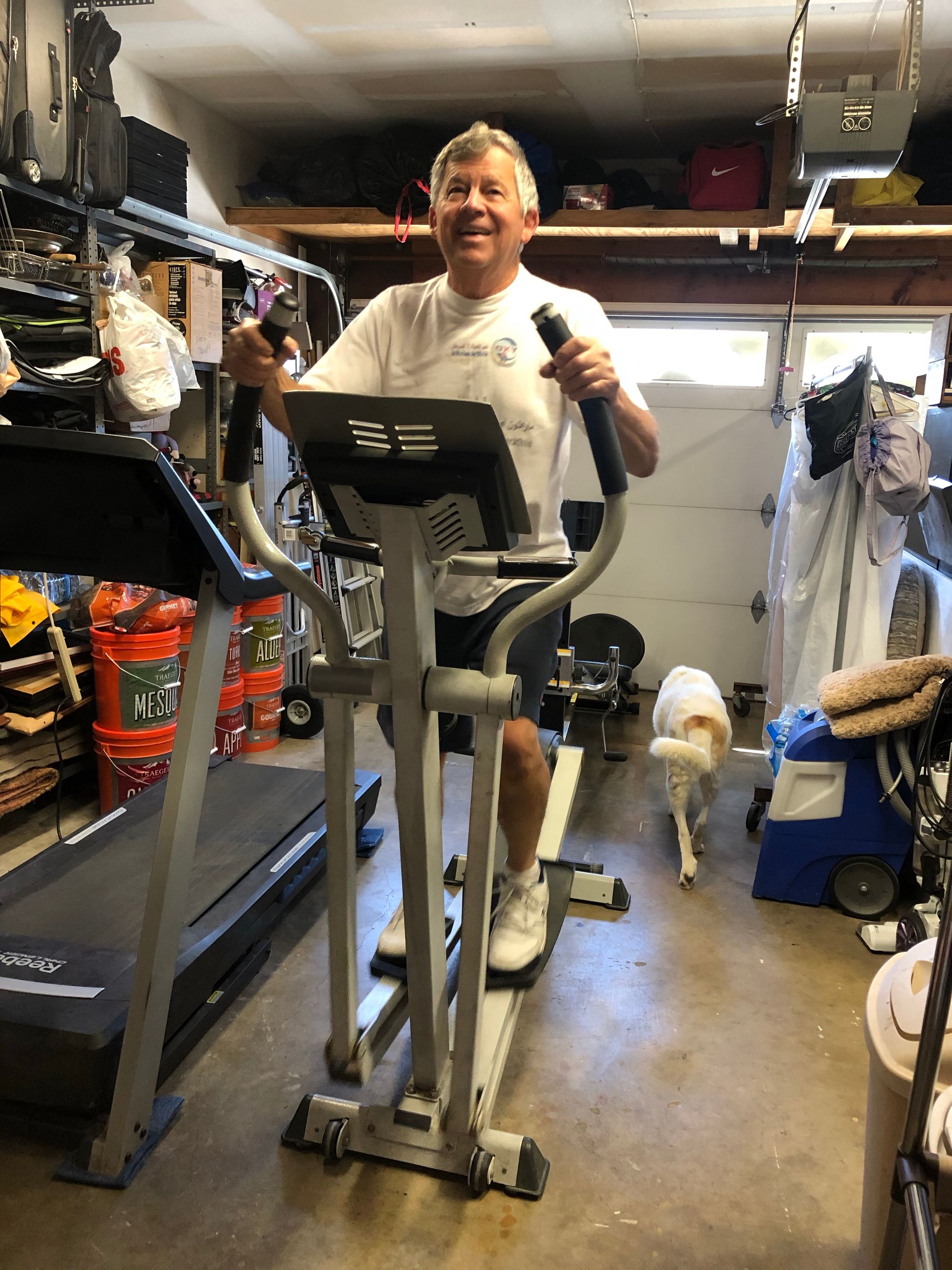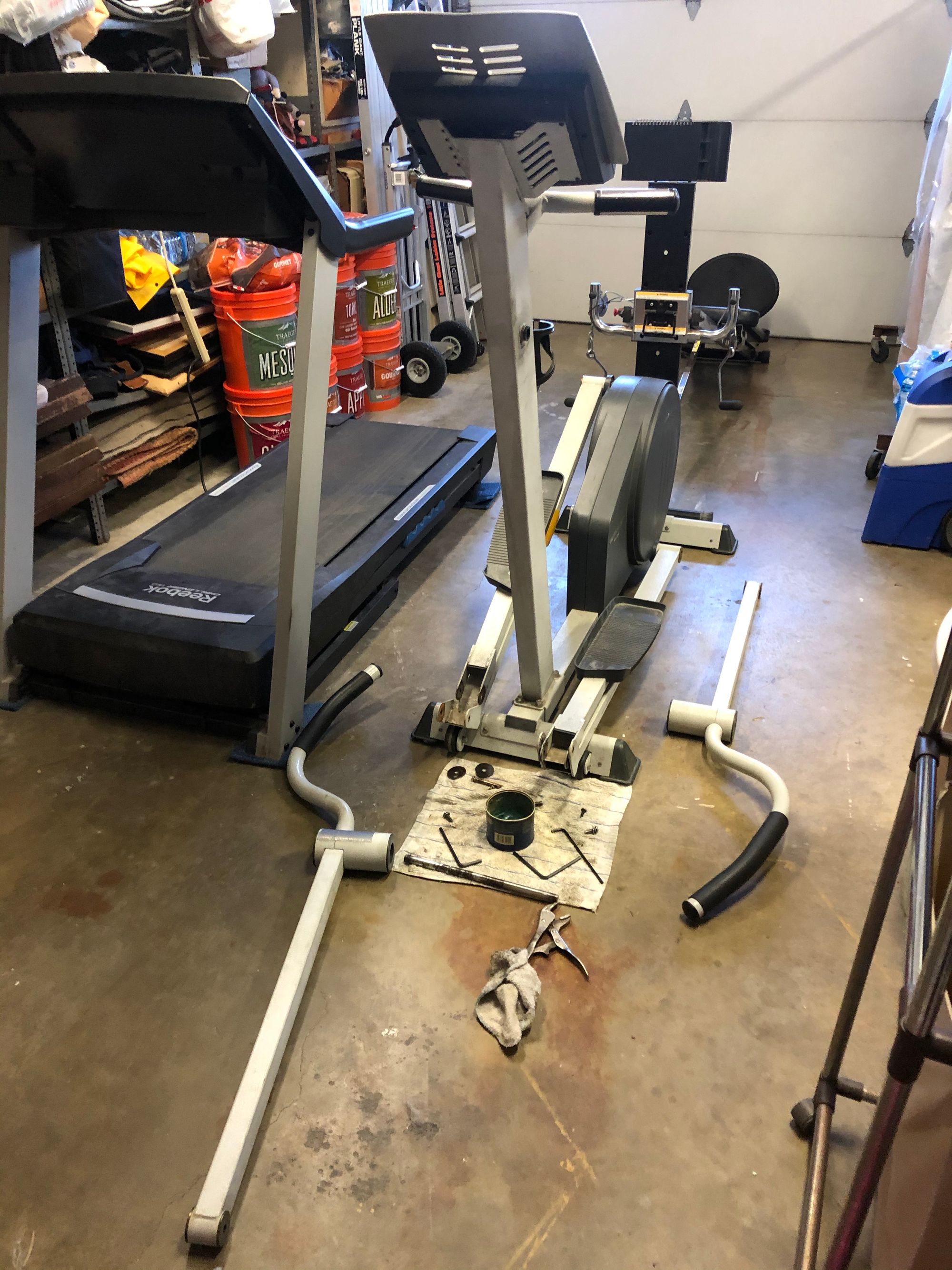 Kathy (equipment operator) alerted me (maintenance) of a squeak developing on her elliptical in our garage gym! Tear down revealed the main shaft on the arm mechanism dry and beginning to score from no lubrication! The main shaft was suitably repaired with Emory Cloth and properly lubricated preventing further damage and likely having to replace the part in the near future had no action been taken. While the equipment was out of service all other joints/shafts were inspected and properly lubricated as well.